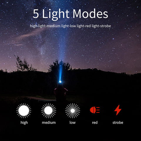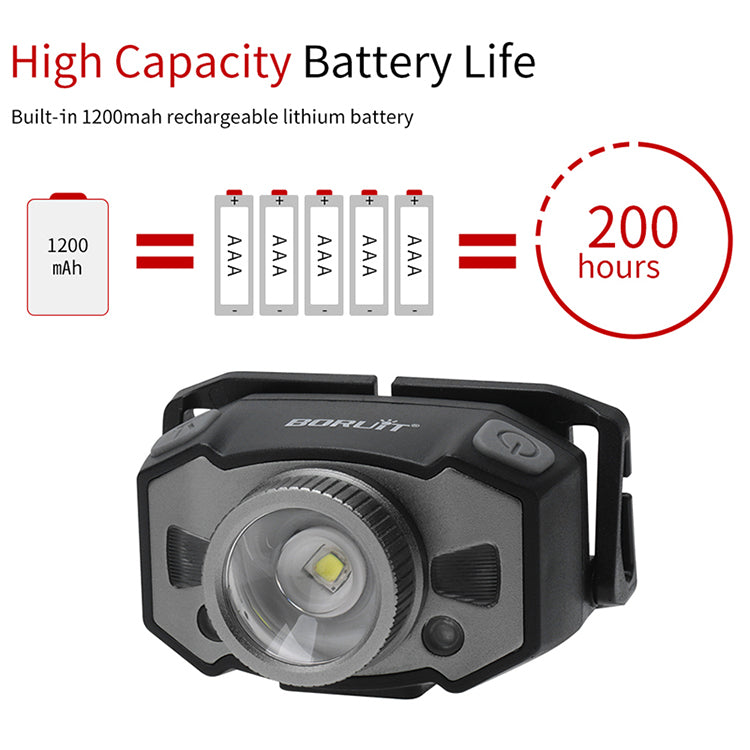 The rechargeable head torch has a built-in 1200 mAh rechargeable lithium battery and is encased in IPX4 waterproof case which allows for it to be used in all conditions.